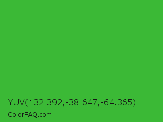 YUV 132.392,-38.647,-64.365 Color is a normal green color and the nearest color is Wageningen Green #34b233. Hex code #3bb936 and RGB value is rgb(59,185,54). In RGB color space, this color is composed of 23% red, 73% green, 21% blue, In CMYK color space, this color is composed of 68% cyan, 0% magenta, 71% yellow , 27% black , In HSL color space, this color has a hue angle of 118° , 55% saturation and 47% lightness.