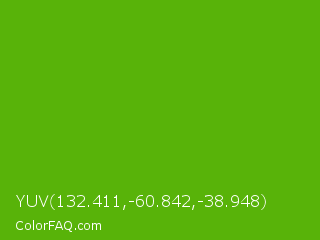 YUV 132.411,-60.842,-38.948 Color is a normal green color and the nearest color is Kelly Green #4cbb17. Hex code #58b309 and RGB value is rgb(88,179,9). In RGB color space, this color is composed of 35% red, 70% green, 4% blue, In CMYK color space, this color is composed of 51% cyan, 0% magenta, 95% yellow , 30% black , In HSL color space, this color has a hue angle of 92° , 90% saturation and 37% lightness.