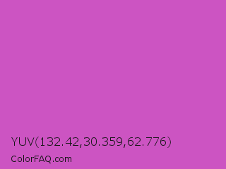 YUV 132.42,30.359,62.776 Color is a normal magenta color and the nearest color is Fuchsia Pink #c154c1. Hex code #cc54c2 and RGB value is rgb(204,84,194). In RGB color space, this color is composed of 80% red, 33% green, 76% blue, In CMYK color space, this color is composed of 0% cyan, 59% magenta, 5% yellow , 20% black , In HSL color space, this color has a hue angle of 305° , 54% saturation and 56% lightness.
