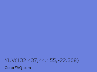 YUV 132.437,44.155,-22.308 Color is a light blue color and the nearest color is Moody Blue #7f76d3. Hex code #6b80de and RGB value is rgb(107,128,222). In RGB color space, this color is composed of 42% red, 50% green, 87% blue, In CMYK color space, this color is composed of 52% cyan, 42% magenta, 0% yellow , 13% black , In HSL color space, this color has a hue angle of 229° , 64% saturation and 65% lightness.