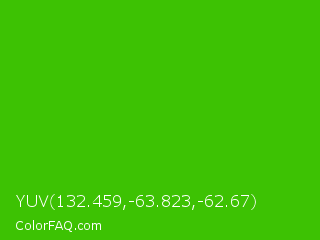 YUV 132.459,-63.823,-62.67 Color is a normal green color and the nearest color is Harlequin Green #46cb18. Hex code #3dc203 and RGB value is rgb(61,194,3). In RGB color space, this color is composed of 24% red, 76% green, 1% blue, In CMYK color space, this color is composed of 69% cyan, 0% magenta, 98% yellow , 24% black , In HSL color space, this color has a hue angle of 102° , 97% saturation and 39% lightness.