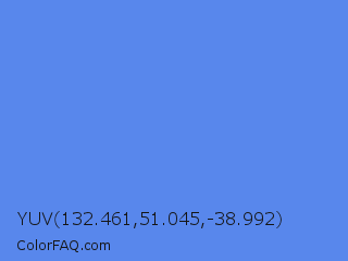 YUV 132.461,51.045,-38.992 Color is a light blue color and the nearest color is United Nations Blue #5b92e5. Hex code #5887ec and RGB value is rgb(88,135,236). In RGB color space, this color is composed of 35% red, 53% green, 93% blue, In CMYK color space, this color is composed of 63% cyan, 43% magenta, 0% yellow , 7% black , In HSL color space, this color has a hue angle of 221° , 80% saturation and 64% lightness.