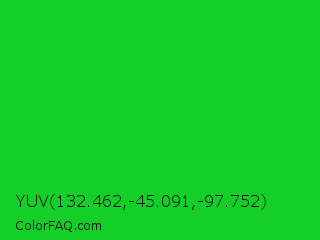YUV 132.462,-45.091,-97.752 Color is a normal green color and the nearest color is Vivid Malachite #00cc33. Hex code #15cf29 and RGB value is rgb(21,207,41). In RGB color space, this color is composed of 8% red, 81% green, 16% blue, In CMYK color space, this color is composed of 90% cyan, 0% magenta, 80% yellow , 19% black , In HSL color space, this color has a hue angle of 126° , 82% saturation and 45% lightness.