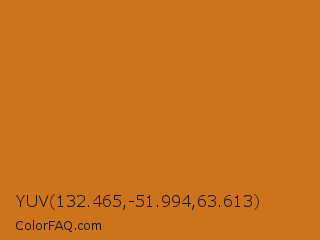 YUV 132.465,-51.994,63.613 Color is a normal orange color and the nearest color is Ochre #cc7722. Hex code #cd741b and RGB value is rgb(205,116,27). In RGB color space, this color is composed of 80% red, 45% green, 11% blue, In CMYK color space, this color is composed of 0% cyan, 43% magenta, 87% yellow , 20% black , In HSL color space, this color has a hue angle of 30° , 77% saturation and 45% lightness.
