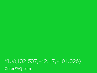 YUV 132.537,-42.17,-101.326 Color is a normal green color and the nearest color is Vivid Malachite #00cc33. Hex code #11d02f and RGB value is rgb(17,208,47). In RGB color space, this color is composed of 7% red, 82% green, 18% blue, In CMYK color space, this color is composed of 92% cyan, 0% magenta, 77% yellow , 18% black , In HSL color space, this color has a hue angle of 129° , 85% saturation and 44% lightness.