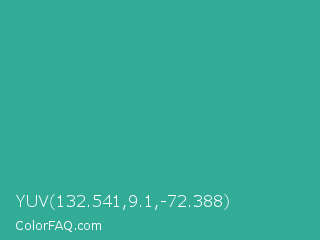 YUV 132.541,9.1,-72.388 Color is a normal cyan color and the nearest color is Keppel #3ab09e. Hex code #32ab97 and RGB value is rgb(50,171,151). In RGB color space, this color is composed of 20% red, 67% green, 59% blue, In CMYK color space, this color is composed of 71% cyan, 0% magenta, 12% yellow , 33% black , In HSL color space, this color has a hue angle of 170° , 55% saturation and 43% lightness.
