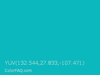 YUV 132.544,27.833,-107.471 Color is a normal cyan color and the nearest color is Tiffany Blue #0abab5. Hex code #0ab8bd and RGB value is rgb(10,184,189). In RGB color space, this color is composed of 4% red, 72% green, 74% blue, In CMYK color space, this color is composed of 95% cyan, 3% magenta, 0% yellow , 26% black , In HSL color space, this color has a hue angle of 182° , 90% saturation and 39% lightness.
