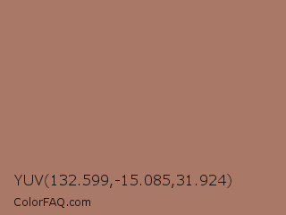 YUV 132.599,-15.085,31.924 Color is a normal orange color and the nearest color is Blast Off Bronze #a57164. Hex code #a97866 and RGB value is rgb(169,120,102). In RGB color space, this color is composed of 66% red, 47% green, 40% blue, In CMYK color space, this color is composed of 0% cyan, 29% magenta, 40% yellow , 34% black , In HSL color space, this color has a hue angle of 16° , 28% saturation and 53% lightness.