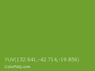 YUV 132.641,-42.714,-19.856 Color is a normal green color and the nearest color is Green RYB #66b032. Hex code #6ea12e and RGB value is rgb(110,161,46). In RGB color space, this color is composed of 43% red, 63% green, 18% blue, In CMYK color space, this color is composed of 32% cyan, 0% magenta, 71% yellow , 37% black , In HSL color space, this color has a hue angle of 87° , 56% saturation and 41% lightness.