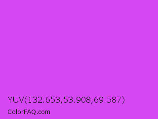 YUV 132.653,53.908,69.587 Color is a light purple color and the nearest color is Medium Orchid #ba55d3. Hex code #d447f2 and RGB value is rgb(212,71,242). In RGB color space, this color is composed of 83% red, 28% green, 95% blue, In CMYK color space, this color is composed of 12% cyan, 71% magenta, 0% yellow , 5% black , In HSL color space, this color has a hue angle of 289° , 87% saturation and 61% lightness.