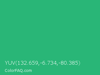 YUV 132.659,-6.734,-80.385 Color is a normal green color and the nearest color is Green Crayola #1cac78. Hex code #29b677 and RGB value is rgb(41,182,119). In RGB color space, this color is composed of 16% red, 71% green, 47% blue, In CMYK color space, this color is composed of 77% cyan, 0% magenta, 35% yellow , 29% black , In HSL color space, this color has a hue angle of 153° , 63% saturation and 44% lightness.