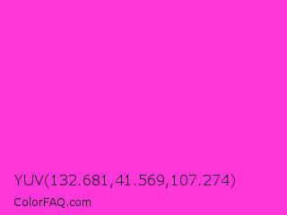 YUV 132.681,41.569,107.274 Color is a light magenta color and the nearest color is Razzle Dazzle Rose #ff33cc. Hex code #ff36d9 and RGB value is rgb(255,54,217). In RGB color space, this color is composed of 100% red, 21% green, 85% blue, In CMYK color space, this color is composed of 0% cyan, 79% magenta, 15% yellow , 0% black , In HSL color space, this color has a hue angle of 311° , 100% saturation and 61% lightness.