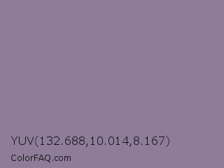 YUV 132.688,10.014,8.167 Color is a normal purple color and the nearest color is Mamba #8e8190. Hex code #8e7c99 and RGB value is rgb(142,124,153). In RGB color space, this color is composed of 56% red, 49% green, 60% blue, In CMYK color space, this color is composed of 7% cyan, 19% magenta, 0% yellow , 40% black , In HSL color space, this color has a hue angle of 277° , 12% saturation and 54% lightness.