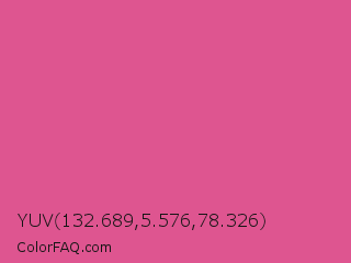 YUV 132.689,5.576,78.326 Color is a normal rose color and the nearest color is Raspberry Pink #e25098. Hex code #de5590 and RGB value is rgb(222,85,144). In RGB color space, this color is composed of 87% red, 33% green, 56% blue, In CMYK color space, this color is composed of 0% cyan, 62% magenta, 35% yellow , 13% black , In HSL color space, this color has a hue angle of 334° , 67% saturation and 60% lightness.