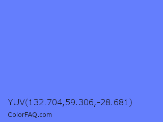 YUV 132.704,59.306,-28.681 Color is a light blue color and the nearest color is Blueberry #4f86f7. Hex code #647efd and RGB value is rgb(100,126,253). In RGB color space, this color is composed of 39% red, 49% green, 99% blue, In CMYK color space, this color is composed of 60% cyan, 50% magenta, 0% yellow , 1% black , In HSL color space, this color has a hue angle of 230° , 97% saturation and 69% lightness.