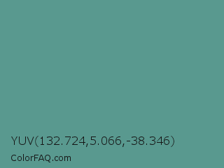 YUV 132.724,5.066,-38.346 Color is a normal cyan color and the nearest color is Patina #639a8f. Hex code #59998f and RGB value is rgb(89,153,143). In RGB color space, this color is composed of 35% red, 60% green, 56% blue, In CMYK color space, this color is composed of 42% cyan, 0% magenta, 7% yellow , 40% black , In HSL color space, this color has a hue angle of 171° , 26% saturation and 47% lightness.