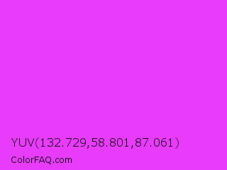 YUV 132.729,58.801,87.061 Color is a light magenta color and the nearest color is Purple Pizzazz #fe4eda. Hex code #e83bfc and RGB value is rgb(232,59,252). In RGB color space, this color is composed of 91% red, 23% green, 99% blue, In CMYK color space, this color is composed of 8% cyan, 77% magenta, 0% yellow , 1% black , In HSL color space, this color has a hue angle of 294° , 97% saturation and 61% lightness.