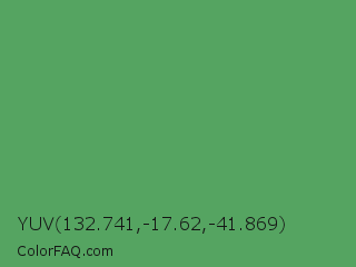 YUV 132.741,-17.62,-41.869 Color is a normal green color and the nearest color is Fruit Salad #4f9d5d. Hex code #55a461 and RGB value is rgb(85,164,97). In RGB color space, this color is composed of 33% red, 64% green, 38% blue, In CMYK color space, this color is composed of 48% cyan, 0% magenta, 41% yellow , 36% black , In HSL color space, this color has a hue angle of 129° , 32% saturation and 49% lightness.