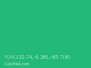 YUV 132.74,-6.281,-85.718 Color is a normal green color and the nearest color is Green Crayola #1cac78. Hex code #23b978 and RGB value is rgb(35,185,120). In RGB color space, this color is composed of 14% red, 73% green, 47% blue, In CMYK color space, this color is composed of 81% cyan, 0% magenta, 35% yellow , 27% black , In HSL color space, this color has a hue angle of 154° , 68% saturation and 43% lightness.