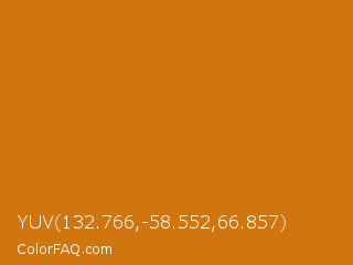 YUV 132.766,-58.552,66.857 Color is a normal orange color and the nearest color is Meteor #d07d12. Hex code #d1750e and RGB value is rgb(209,117,14). In RGB color space, this color is composed of 82% red, 46% green, 5% blue, In CMYK color space, this color is composed of 0% cyan, 44% magenta, 93% yellow , 18% black , In HSL color space, this color has a hue angle of 32° , 87% saturation and 44% lightness.