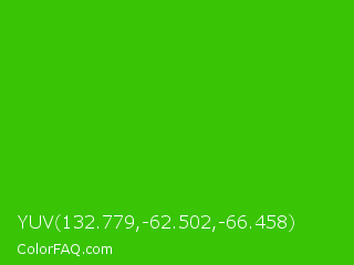 YUV 132.779,-62.502,-66.458 Color is a normal green color and the nearest color is Harlequin Green #46cb18. Hex code #39c406 and RGB value is rgb(57,196,6). In RGB color space, this color is composed of 22% red, 77% green, 2% blue, In CMYK color space, this color is composed of 71% cyan, 0% magenta, 97% yellow , 23% black , In HSL color space, this color has a hue angle of 104° , 94% saturation and 40% lightness.