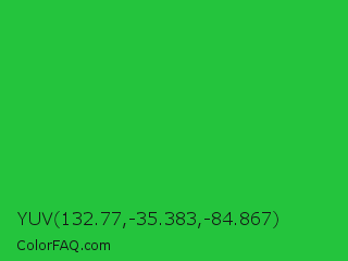 YUV 132.77,-35.383,-84.867 Color is a normal green color and the nearest color is Lime Green #32cd32. Hex code #24c43d and RGB value is rgb(36,196,61). In RGB color space, this color is composed of 14% red, 77% green, 24% blue, In CMYK color space, this color is composed of 82% cyan, 0% magenta, 69% yellow , 23% black , In HSL color space, this color has a hue angle of 129° , 69% saturation and 45% lightness.