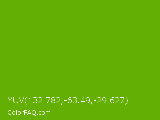 YUV 132.782,-63.49,-29.627 Color is a normal green color and the nearest color is Christi #67a712. Hex code #63af04 and RGB value is rgb(99,175,4). In RGB color space, this color is composed of 39% red, 69% green, 2% blue, In CMYK color space, this color is composed of 43% cyan, 0% magenta, 98% yellow , 31% black , In HSL color space, this color has a hue angle of 87° , 96% saturation and 35% lightness.