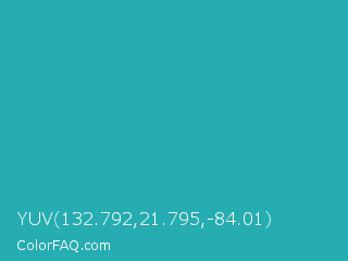 YUV 132.792,21.795,-84.01 Color is a normal cyan color and the nearest color is Light Sea Green #20b2aa. Hex code #25adb1 and RGB value is rgb(37,173,177). In RGB color space, this color is composed of 15% red, 68% green, 69% blue, In CMYK color space, this color is composed of 79% cyan, 2% magenta, 0% yellow , 31% black , In HSL color space, this color has a hue angle of 182° , 65% saturation and 42% lightness.