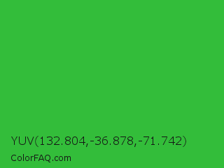 YUV 132.804,-36.878,-71.742 Color is a normal green color and the nearest color is Wageningen Green #34b233. Hex code #33bd3a and RGB value is rgb(51,189,58). In RGB color space, this color is composed of 20% red, 74% green, 23% blue, In CMYK color space, this color is composed of 73% cyan, 0% magenta, 69% yellow , 26% black , In HSL color space, this color has a hue angle of 123° , 58% saturation and 47% lightness.