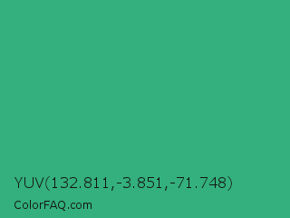 YUV 132.811,-3.851,-71.748 Color is a normal green color and the nearest color is Jungle Green #29ab87. Hex code #33b07d and RGB value is rgb(51,176,125). In RGB color space, this color is composed of 20% red, 69% green, 49% blue, In CMYK color space, this color is composed of 71% cyan, 0% magenta, 29% yellow , 31% black , In HSL color space, this color has a hue angle of 156° , 55% saturation and 45% lightness.