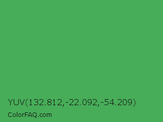 YUV 132.812,-22.092,-54.209 Color is a normal green color and the nearest color is Chateau Green #40a860. Hex code #47ad58 and RGB value is rgb(71,173,88). In RGB color space, this color is composed of 28% red, 68% green, 35% blue, In CMYK color space, this color is composed of 59% cyan, 0% magenta, 49% yellow , 32% black , In HSL color space, this color has a hue angle of 130° , 42% saturation and 48% lightness.