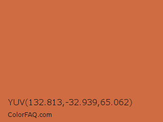YUV 132.813,-32.939,65.062 Color is a normal orange color and the nearest color is Red Damask #da6a41. Hex code #cf6c42 and RGB value is rgb(207,108,66). In RGB color space, this color is composed of 81% red, 42% green, 26% blue, In CMYK color space, this color is composed of 0% cyan, 48% magenta, 68% yellow , 19% black , In HSL color space, this color has a hue angle of 18° , 59% saturation and 54% lightness.