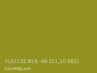 YUV 132.819,-49.211,10.683 Color is a normal yellow color and the nearest color is Hacienda #98811b. Hex code #919221 and RGB value is rgb(145,146,33). In RGB color space, this color is composed of 57% red, 57% green, 13% blue, In CMYK color space, this color is composed of 1% cyan, 0% magenta, 77% yellow , 43% black , In HSL color space, this color has a hue angle of 61° , 63% saturation and 35% lightness.