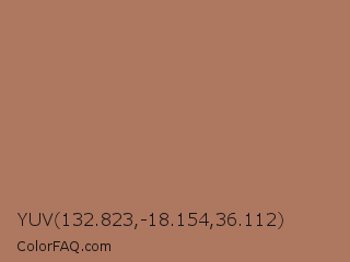 YUV 132.823,-18.154,36.112 Color is a normal orange color and the nearest color is French Beige #a67b5b. Hex code #ae7760 and RGB value is rgb(174,119,96). In RGB color space, this color is composed of 68% red, 47% green, 38% blue, In CMYK color space, this color is composed of 0% cyan, 32% magenta, 45% yellow , 32% black , In HSL color space, this color has a hue angle of 18° , 33% saturation and 53% lightness.