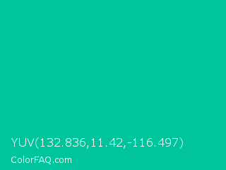 YUV 132.836,11.42,-116.497 Color is a normal cyan color and the nearest color is Caribbean Green #00cc99. Hex code #00c49c and RGB value is rgb(0,196,156). In RGB color space, this color is composed of 0% red, 77% green, 61% blue, In CMYK color space, this color is composed of 100% cyan, 0% magenta, 20% yellow , 23% black , In HSL color space, this color has a hue angle of 168° , 100% saturation and 38% lightness.