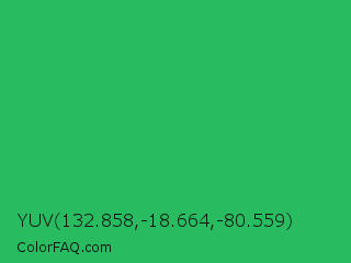 YUV 132.858,-18.664,-80.559 Color is a normal green color and the nearest color is Medium Sea Green #3cb371. Hex code #29bb5f and RGB value is rgb(41,187,95). In RGB color space, this color is composed of 16% red, 73% green, 37% blue, In CMYK color space, this color is composed of 78% cyan, 0% magenta, 49% yellow , 27% black , In HSL color space, this color has a hue angle of 142° , 64% saturation and 45% lightness.