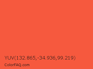 YUV 132.865,-34.936,99.219 Color is a normal red color and the nearest color is Orange Soda #fa5b3d. Hex code #f6593e and RGB value is rgb(246,89,62). In RGB color space, this color is composed of 96% red, 35% green, 24% blue, In CMYK color space, this color is composed of 0% cyan, 64% magenta, 75% yellow , 4% black , In HSL color space, this color has a hue angle of 9° , 91% saturation and 60% lightness.