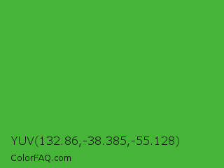 YUV 132.86,-38.385,-55.128 Color is a normal green color and the nearest color is Apple #4fa83d. Hex code #46b437 and RGB value is rgb(70,180,55). In RGB color space, this color is composed of 27% red, 71% green, 22% blue, In CMYK color space, this color is composed of 61% cyan, 0% magenta, 69% yellow , 29% black , In HSL color space, this color has a hue angle of 113° , 53% saturation and 46% lightness.