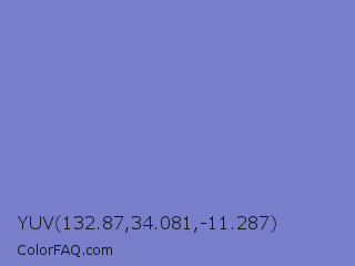 YUV 132.87,34.081,-11.287 Color is a light blue color and the nearest color is Moody Blue #7f76d3. Hex code #787eca and RGB value is rgb(120,126,202). In RGB color space, this color is composed of 47% red, 49% green, 79% blue, In CMYK color space, this color is composed of 41% cyan, 38% magenta, 0% yellow , 21% black , In HSL color space, this color has a hue angle of 236° , 44% saturation and 63% lightness.