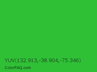 YUV 132.913,-38.904,-75.346 Color is a normal green color and the nearest color is Lime Green #32cd32. Hex code #2fc036 and RGB value is rgb(47,192,54). In RGB color space, this color is composed of 18% red, 75% green, 21% blue, In CMYK color space, this color is composed of 76% cyan, 0% magenta, 72% yellow , 25% black , In HSL color space, this color has a hue angle of 123° , 61% saturation and 47% lightness.