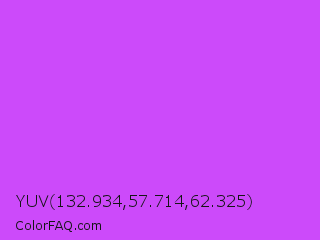 YUV 132.934,57.714,62.325 Color is a light purple color and the nearest color is Medium Orchid #ba55d3. Hex code #cc4afa and RGB value is rgb(204,74,250). In RGB color space, this color is composed of 80% red, 29% green, 98% blue, In CMYK color space, this color is composed of 18% cyan, 70% magenta, 0% yellow , 2% black , In HSL color space, this color has a hue angle of 284° , 95% saturation and 64% lightness.