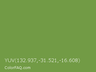 YUV 132.937,-31.521,-16.608 Color is a normal green color and the nearest color is Palm Leaf #6f9940. Hex code #729b45 and RGB value is rgb(114,155,69). In RGB color space, this color is composed of 45% red, 61% green, 27% blue, In CMYK color space, this color is composed of 26% cyan, 0% magenta, 55% yellow , 39% black , In HSL color space, this color has a hue angle of 89° , 38% saturation and 44% lightness.