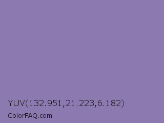 YUV 132.951,21.223,6.182 Color is a normal violet color and the nearest color is Purple Mountains Majesty #9678b6. Hex code #8c79b0 and RGB value is rgb(140,121,176). In RGB color space, this color is composed of 55% red, 47% green, 69% blue, In CMYK color space, this color is composed of 20% cyan, 31% magenta, 0% yellow , 31% black , In HSL color space, this color has a hue angle of 261° , 26% saturation and 58% lightness.