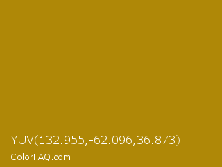 YUV 132.955,-62.096,36.873 Color is a normal yellow color and the nearest color is Hot Toddy #b38007. Hex code #af8807 and RGB value is rgb(175,136,7). In RGB color space, this color is composed of 69% red, 53% green, 3% blue, In CMYK color space, this color is composed of 0% cyan, 22% magenta, 96% yellow , 31% black , In HSL color space, this color has a hue angle of 46° , 92% saturation and 36% lightness.