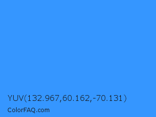 YUV 132.967,60.162,-70.131 Color is a normal blue color and the nearest color is Brilliant Azure #3399ff. Hex code #3596ff and RGB value is rgb(53,150,255). In RGB color space, this color is composed of 21% red, 59% green, 100% blue, In CMYK color space, this color is composed of 79% cyan, 41% magenta, 0% yellow , 0% black , In HSL color space, this color has a hue angle of 211° , 100% saturation and 60% lightness.