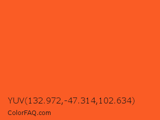 YUV 132.972,-47.314,102.634 Color is a normal color and the nearest color is Giants Orange #fe5a1d. Hex code #fa5c25 and RGB value is rgb(250,92,37). In RGB color space, this color is composed of 98% red, 36% green, 15% blue, In CMYK color space, this color is composed of 0% cyan, 63% magenta, 85% yellow , 2% black , In HSL color space, this color has a hue angle of 15° , 96% saturation and 56% lightness.