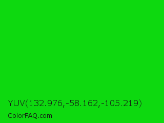 YUV 132.976,-58.162,-105.219 Color is a normal green color and the nearest color is Vivid Malachite #00cc33. Hex code #0dd90f and RGB value is rgb(13,217,15). In RGB color space, this color is composed of 5% red, 85% green, 6% blue, In CMYK color space, this color is composed of 94% cyan, 0% magenta, 93% yellow , 15% black , In HSL color space, this color has a hue angle of 121° , 89% saturation and 45% lightness.