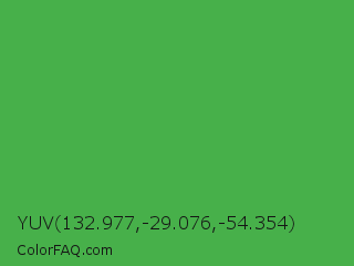 YUV 132.977,-29.076,-54.354 Color is a normal green color and the nearest color is Apple #4fa83d. Hex code #47b04a and RGB value is rgb(71,176,74). In RGB color space, this color is composed of 28% red, 69% green, 29% blue, In CMYK color space, this color is composed of 60% cyan, 0% magenta, 58% yellow , 31% black , In HSL color space, this color has a hue angle of 122° , 43% saturation and 48% lightness.