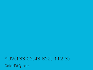 YUV 133.05,43.852,-112.3 Color is a normal cyan color and the nearest color is Cyan Process #00b7eb. Hex code #05b5de and RGB value is rgb(5,181,222). In RGB color space, this color is composed of 2% red, 71% green, 87% blue, In CMYK color space, this color is composed of 98% cyan, 18% magenta, 0% yellow , 13% black , In HSL color space, this color has a hue angle of 191° , 96% saturation and 45% lightness.