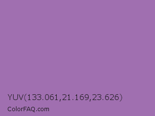 YUV 133.061,21.169,23.626 Color is a normal purple color and the nearest color is Wisteria #9771b5. Hex code #a06fb0 and RGB value is rgb(160,111,176). In RGB color space, this color is composed of 63% red, 44% green, 69% blue, In CMYK color space, this color is composed of 9% cyan, 37% magenta, 0% yellow , 31% black , In HSL color space, this color has a hue angle of 285° , 29% saturation and 56% lightness.